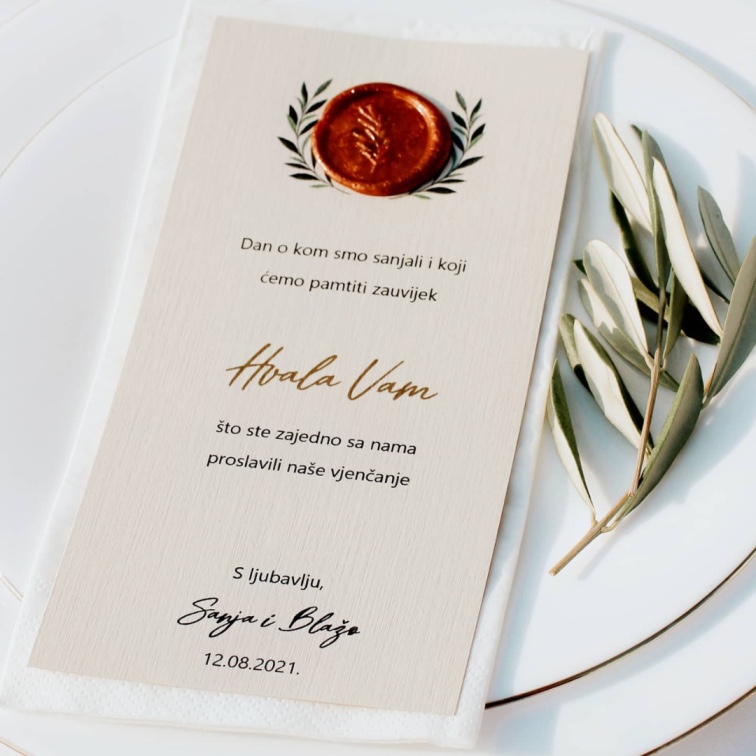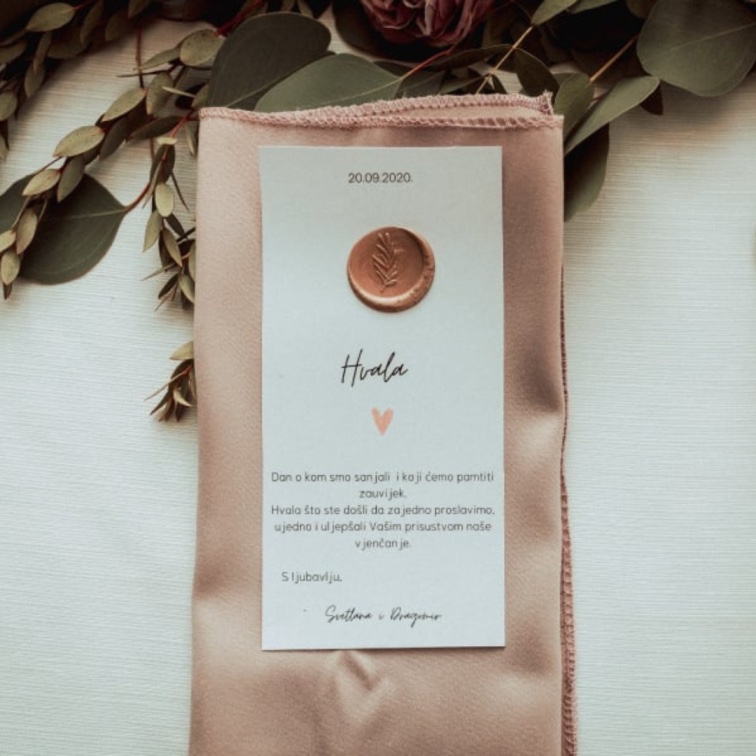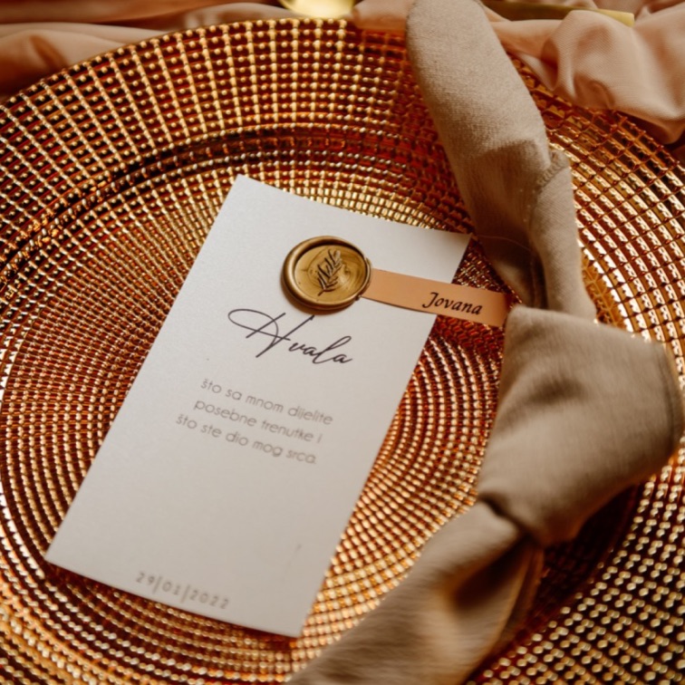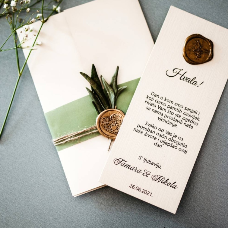 Sa fokusom na svaki detalj, naše zahvalnice za vjenčanje će zadiviti vaše goste i taj poseban dan zauvijek zadržati u sjećanju. Odabirom iz naše široke palete zahvalnica, moći ćete da istaknete svoj stil i izrazite zahvalnost prema svakom gostu.